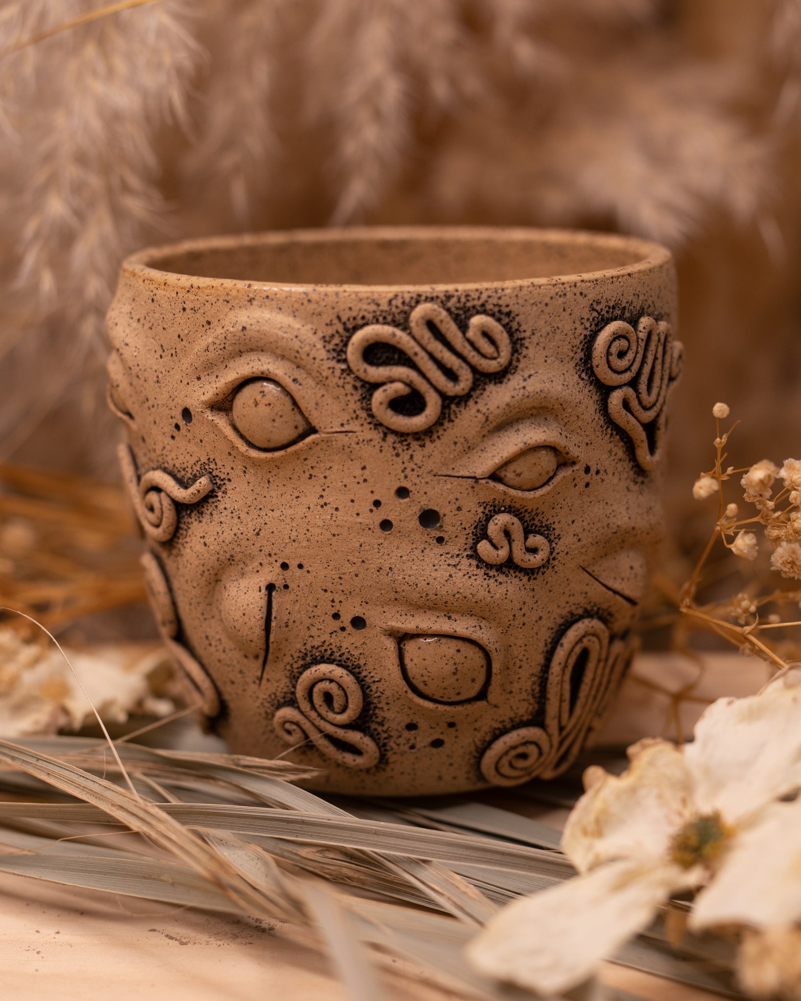 This bowl started as a ball of warm, speckled clay that was thrown on the pottery wheel. Once firm enough to work, it was trimmed and covered in hand-sculpted eyes and swirls.