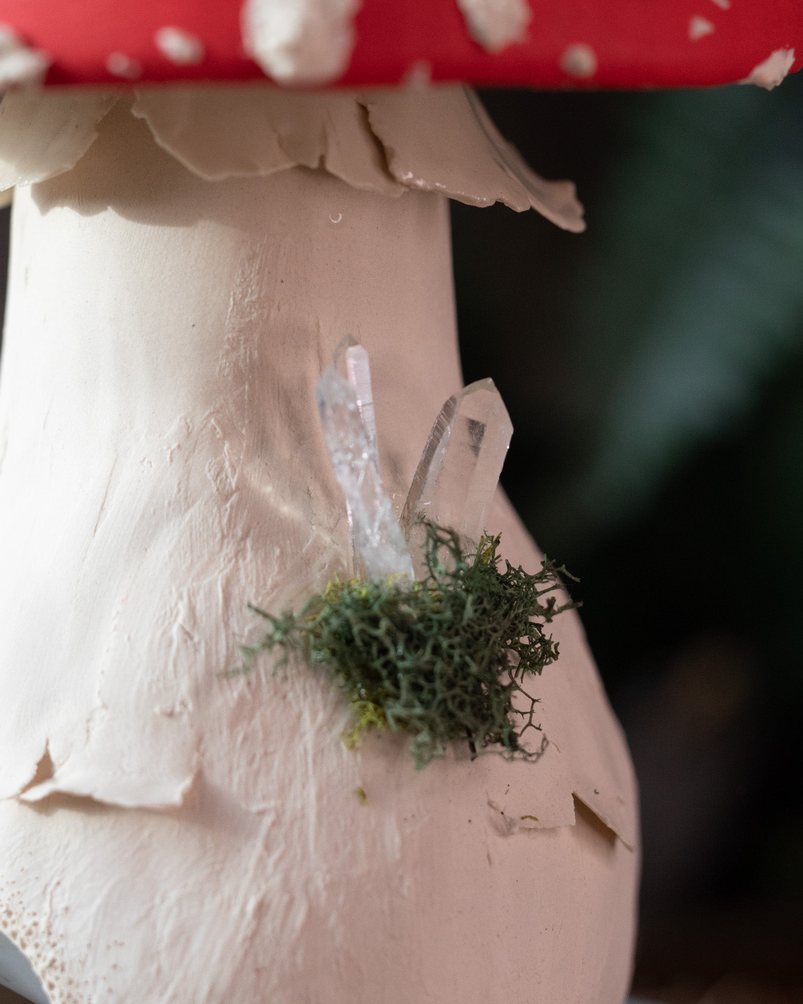 On the stem of the mushroom is a clusters of AAA+ clear quartz that bathed in the healing light of the super full moon on October 17th.