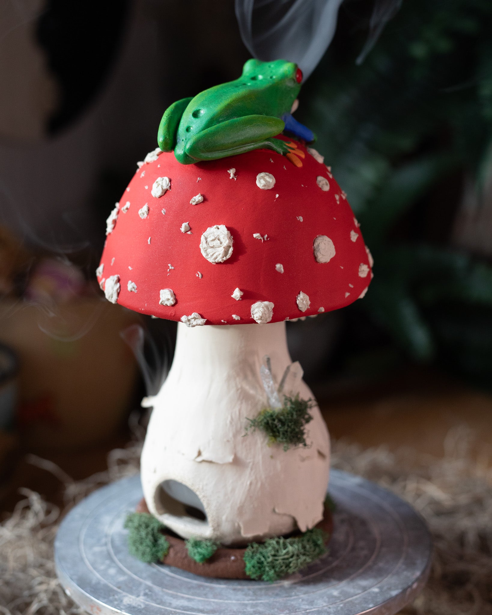 The mushroom was hand-built and sculpted with white stoneware clay then joined with hand-sculpted frogs. After slowly drying it was fired in the kiln, glazed, then fired again.
