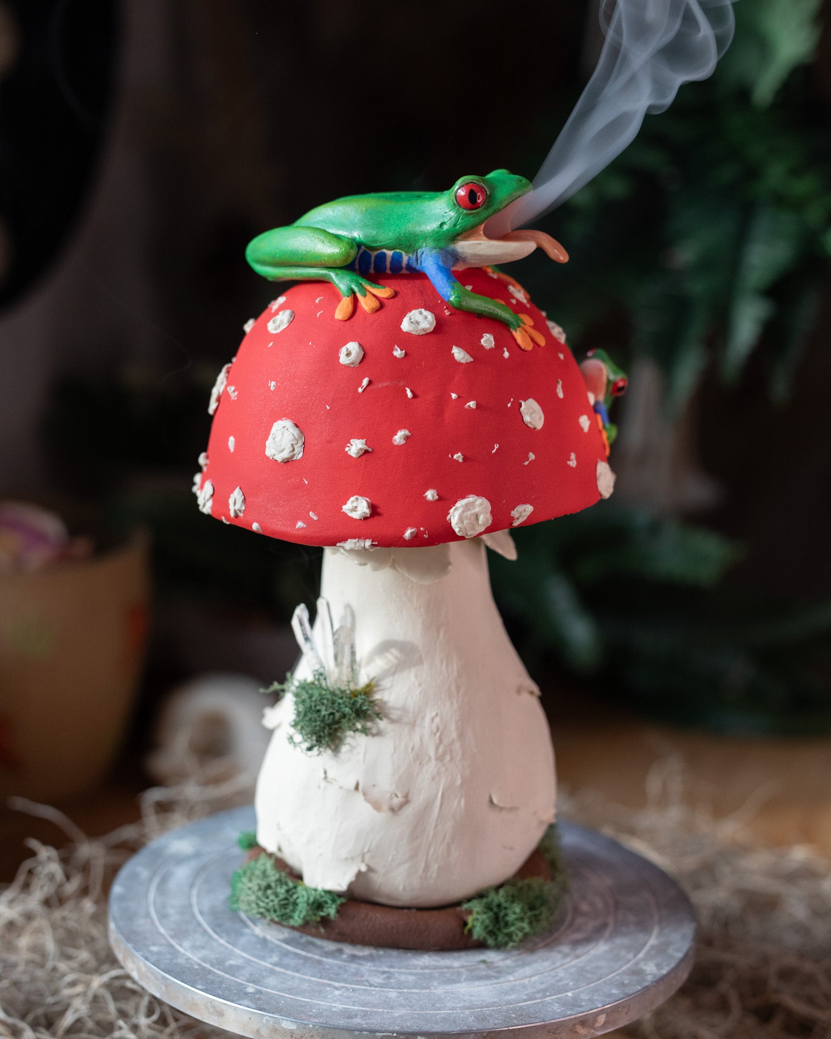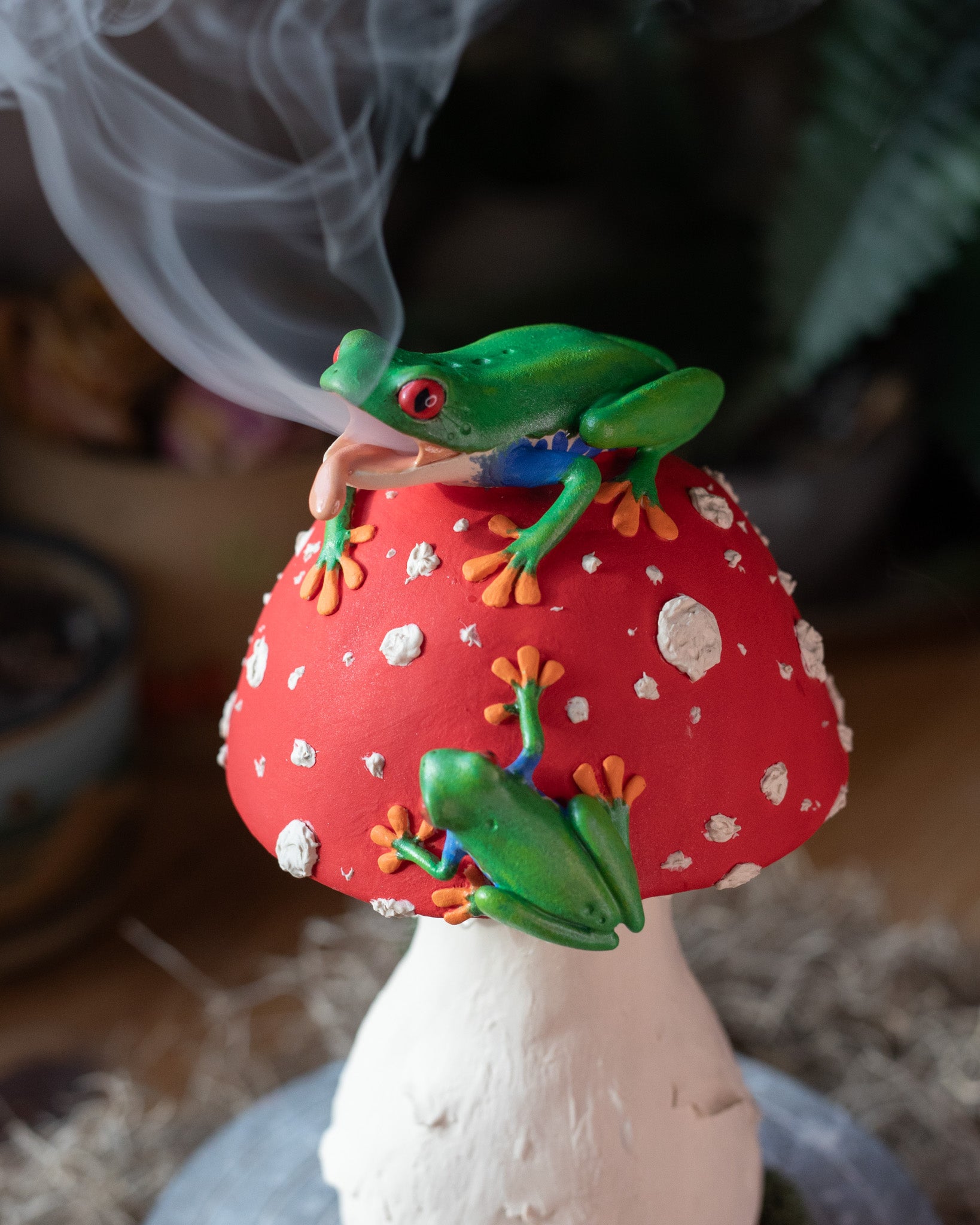 When given a lit cone of incense or choice of cleansing medicine, the perched frog smokes from his mouth while the other watches curiously!