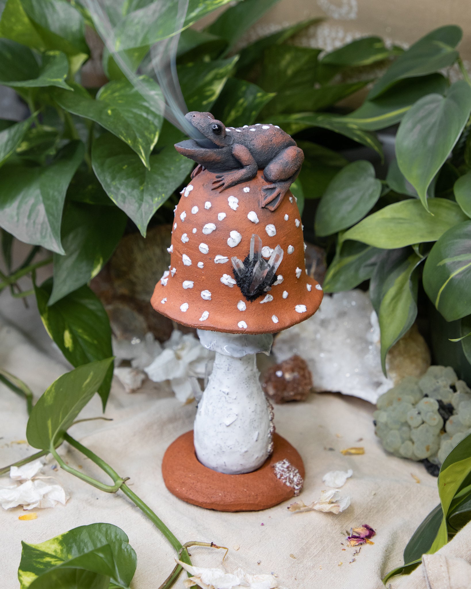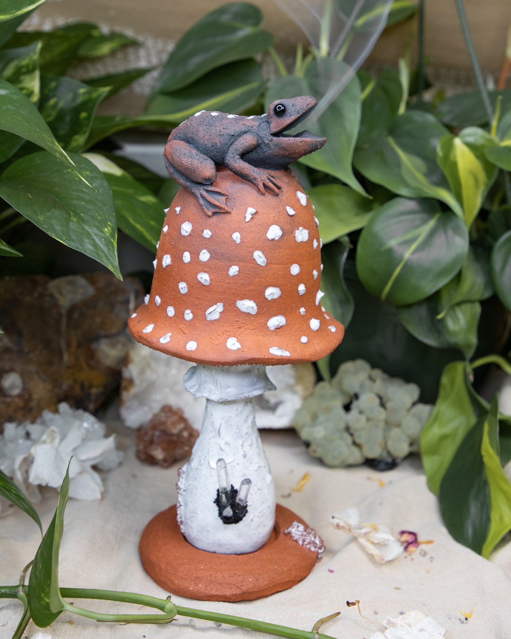 The mushroom was thrown on the pottery wheel with red stoneware clay then joined with a hand-sculpted frog. After slowly drying for weeks, it was fired in the kiln until hard and porous. The piece was painted with various glazes to accentuate details, then fired once more.