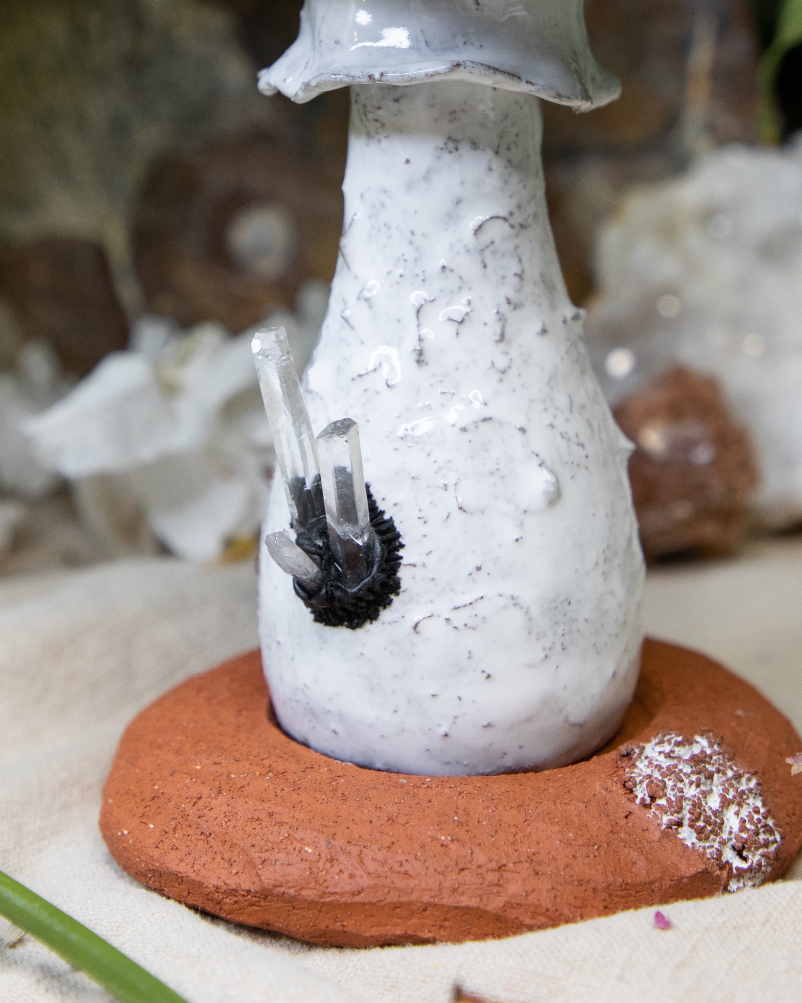 This earthy smoker is a beautiful, interactive art piece. On the cap and stem of the mushroom are clusters of AAA+ clear quartz that bathed in the healing light of the full moon.
