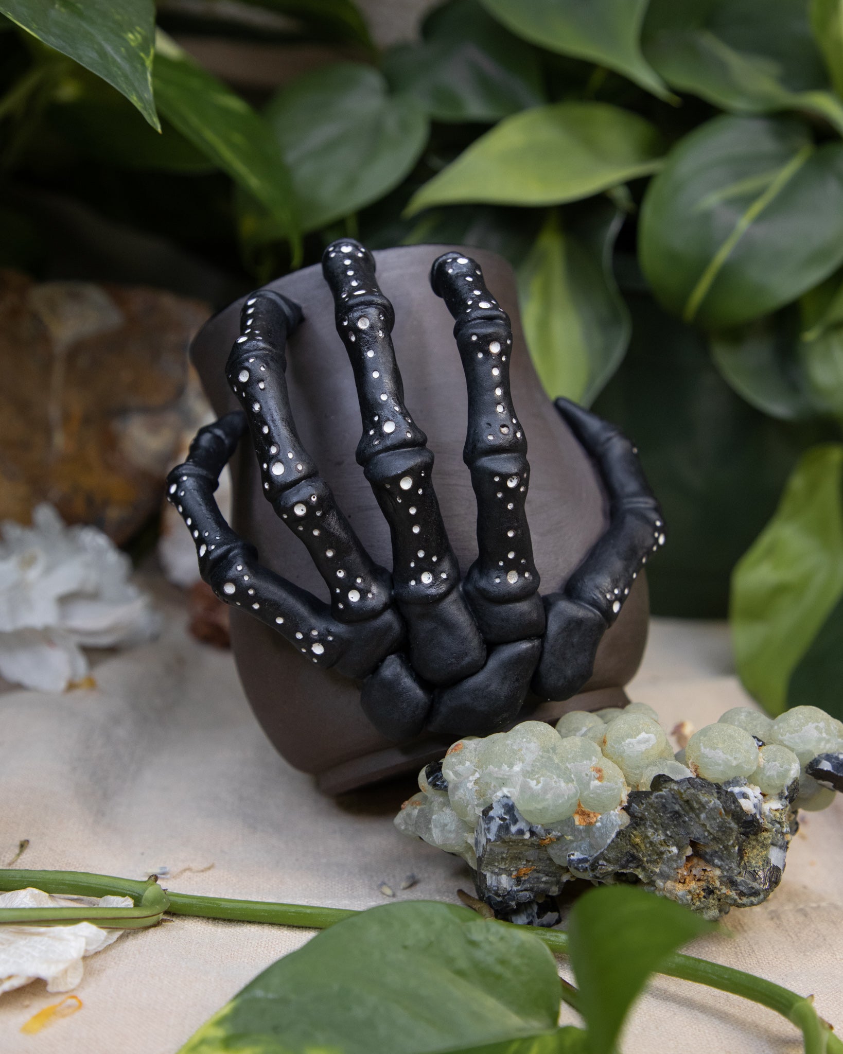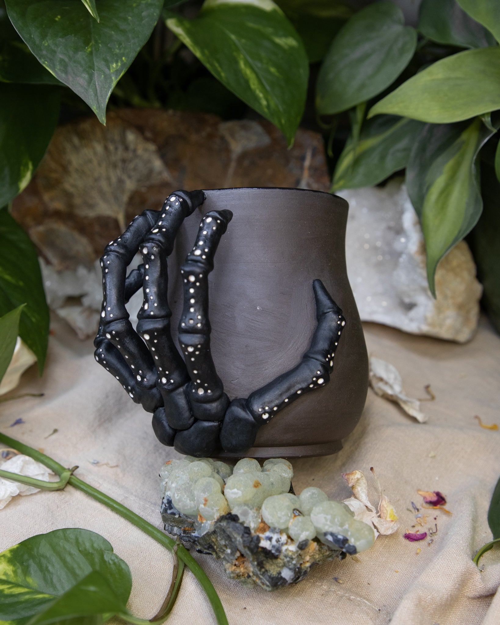 The mug was thrown on the wheel with black, stoneware clay. The skeleton hand was hand-sculpted and carefully attached to the side of the mug. After drying slowly the mug was fired twice in the kiln.