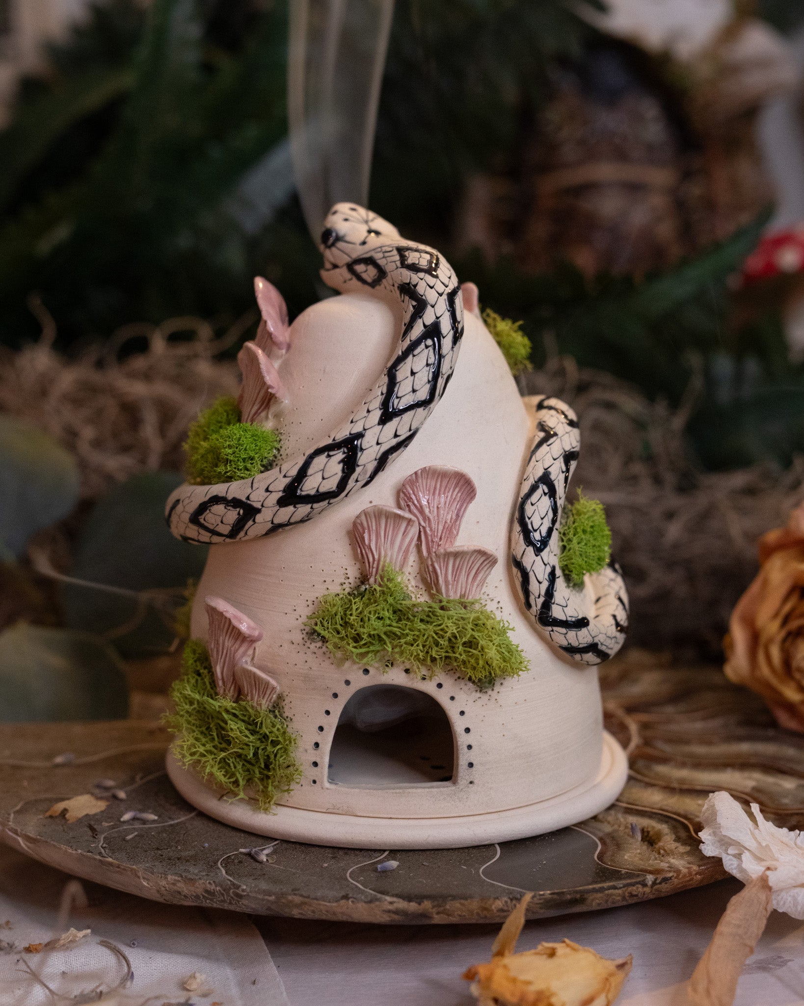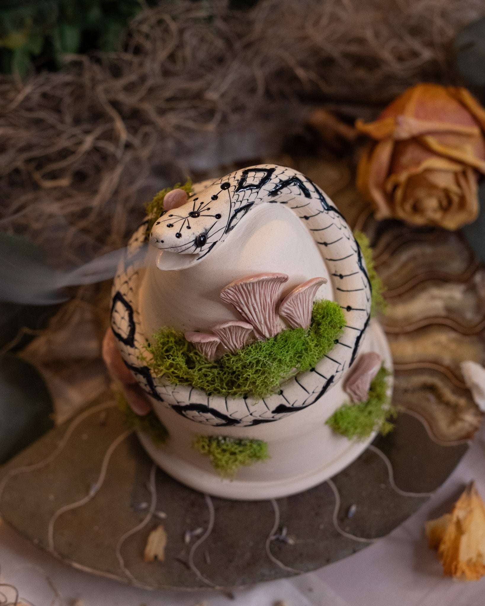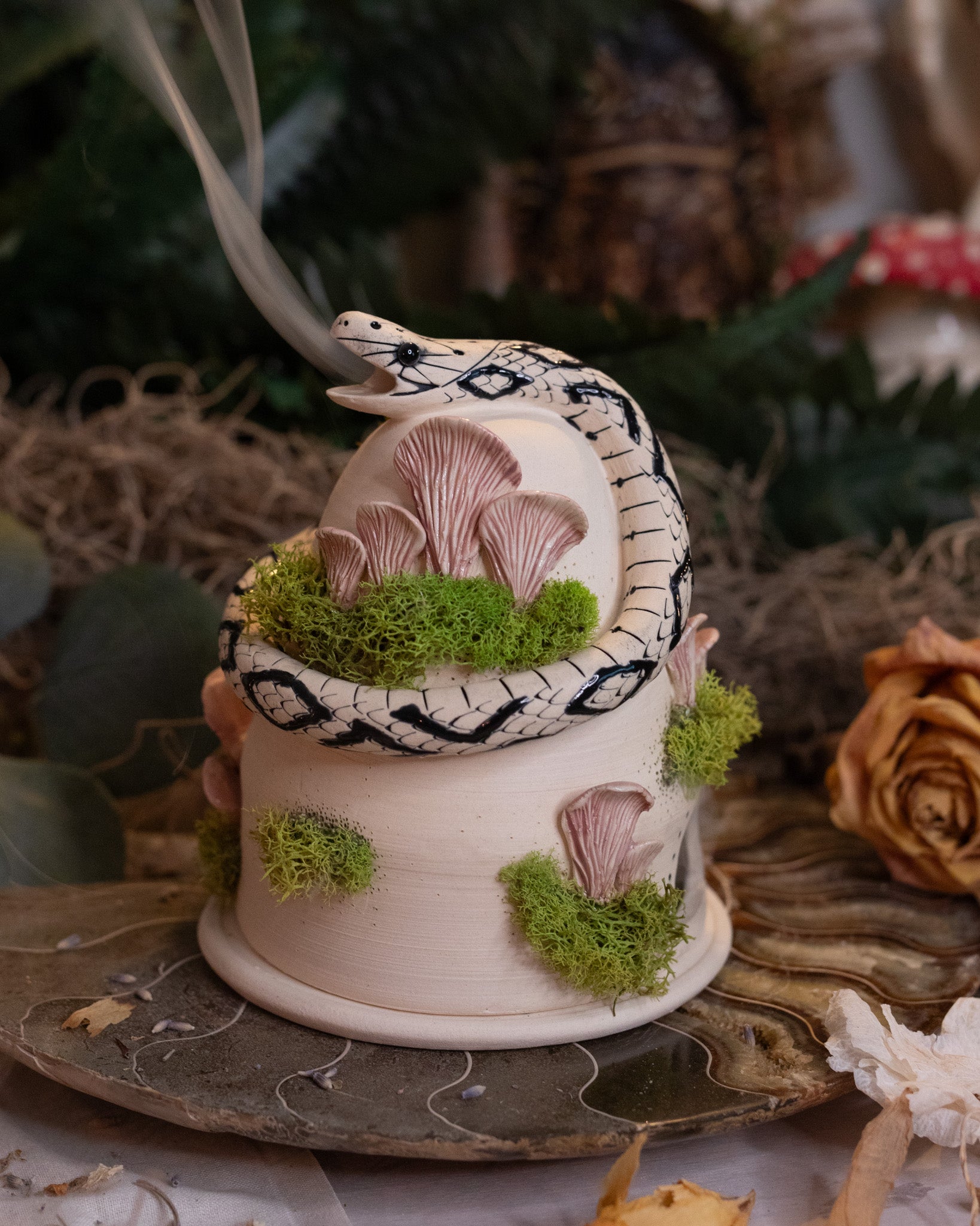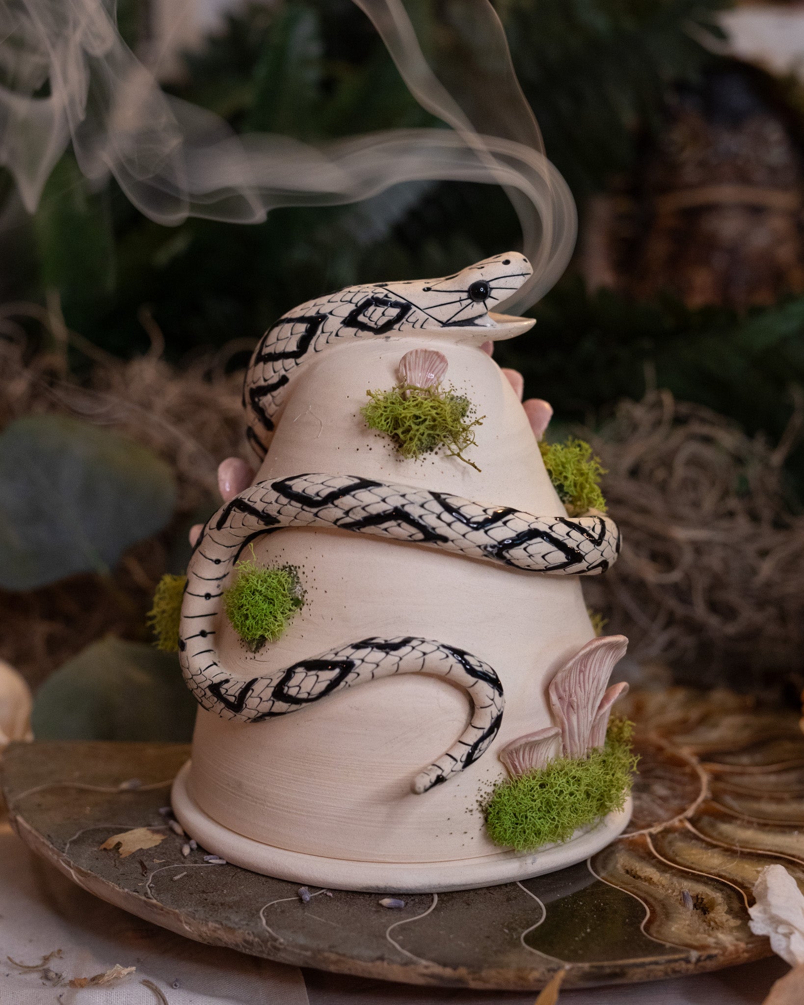 This smoker stater as two balls of white stoneware clay that were thrown on the pottery wheel. Once firm enough to work, it was trimmed then joined with a hand-sculpted serpent and fungi. After slowly drying, it was fired in the kiln, glazed then fired once more. It is adorned with real, preserved moss.