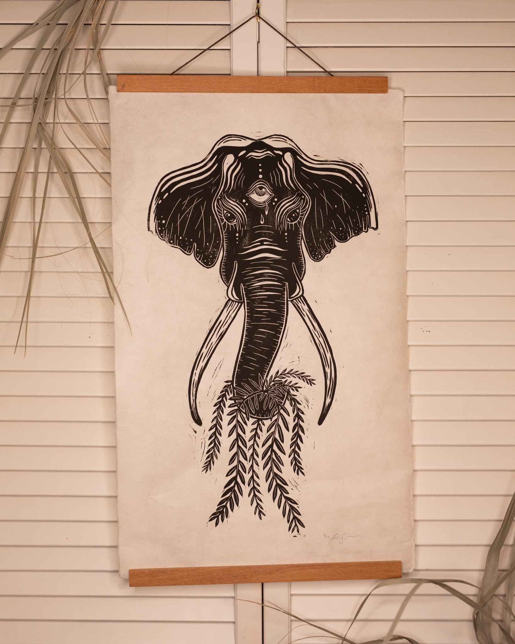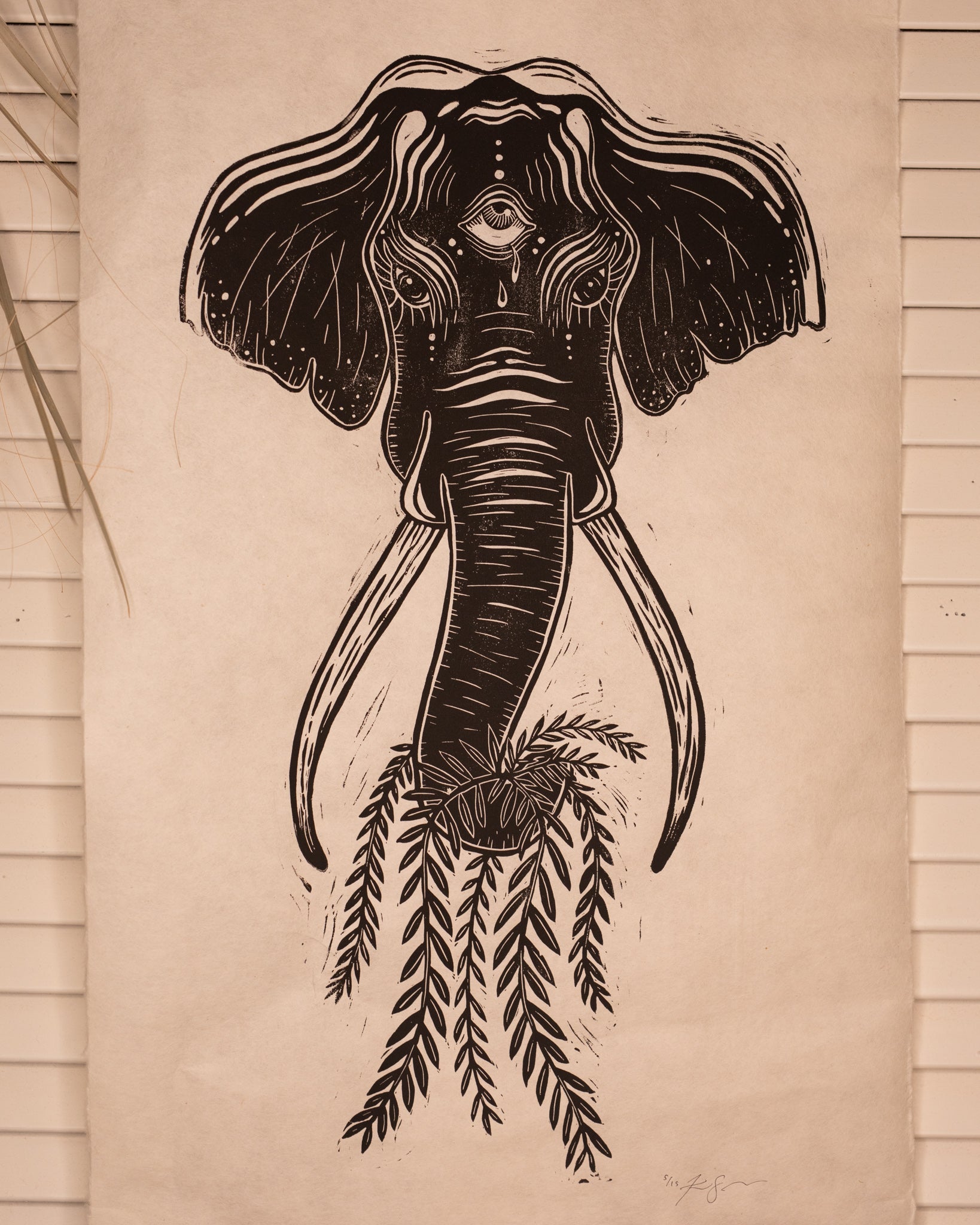 Black ink was rolled onto the block then pressed onto a sheet of handmade mulberry paper. Finally, the print was hung to dry. You will receive one edition of 20 limited prints.