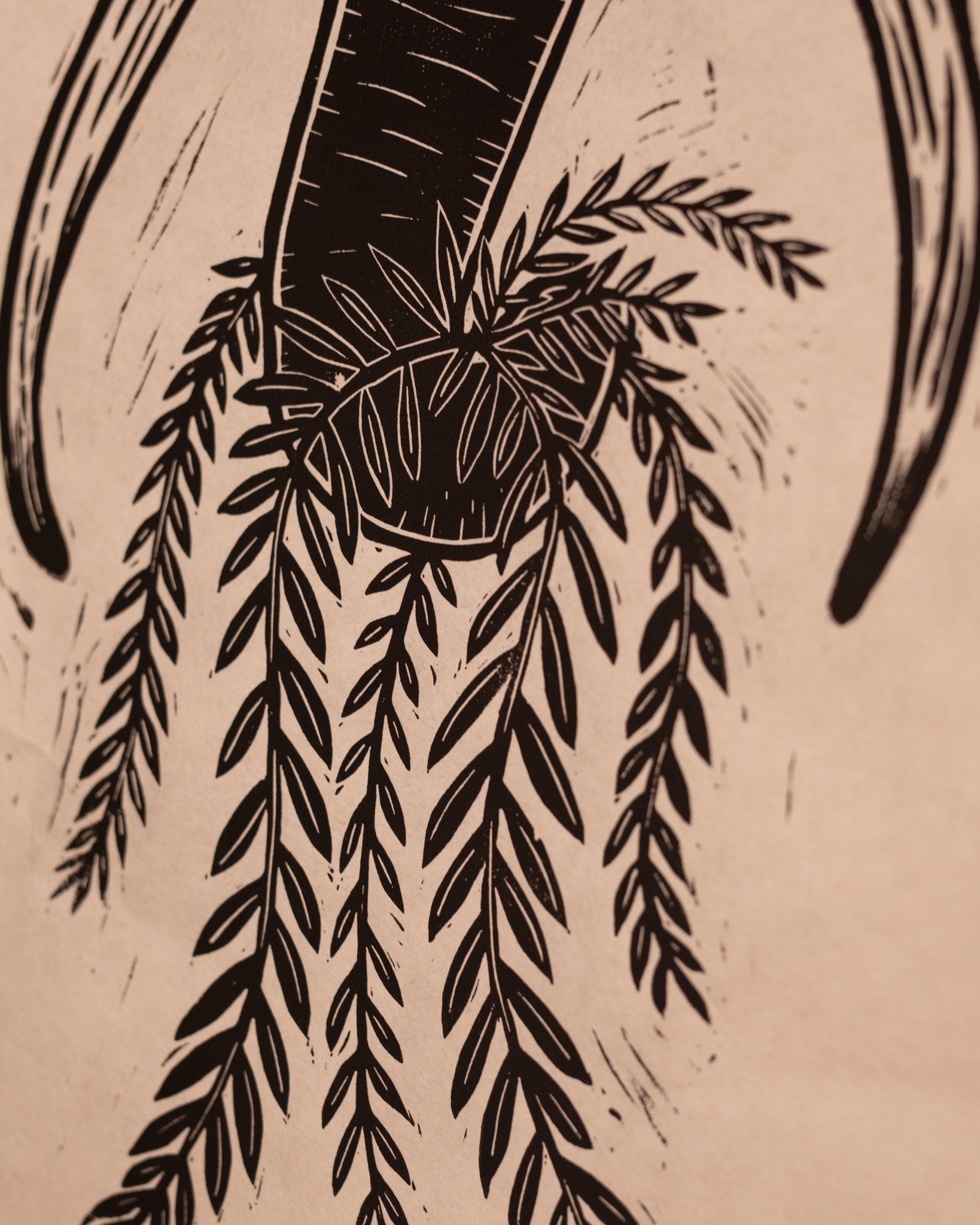 The prints journey began as a pencil sketch then was finished digitally in a drawing program. The image was transferred to a linoleum block that was carved by hand over several days.