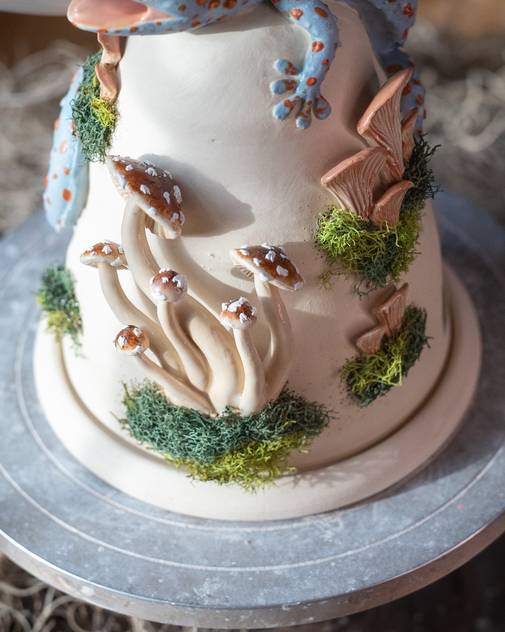 The base of the smoker was thrown on the wheel with white, stoneware clay. Then it was joined with a hand-sculpted gecko surrounded by fungi and moss. After slowly drying it was fired in the kiln then painted in vibrant colors and fired again.