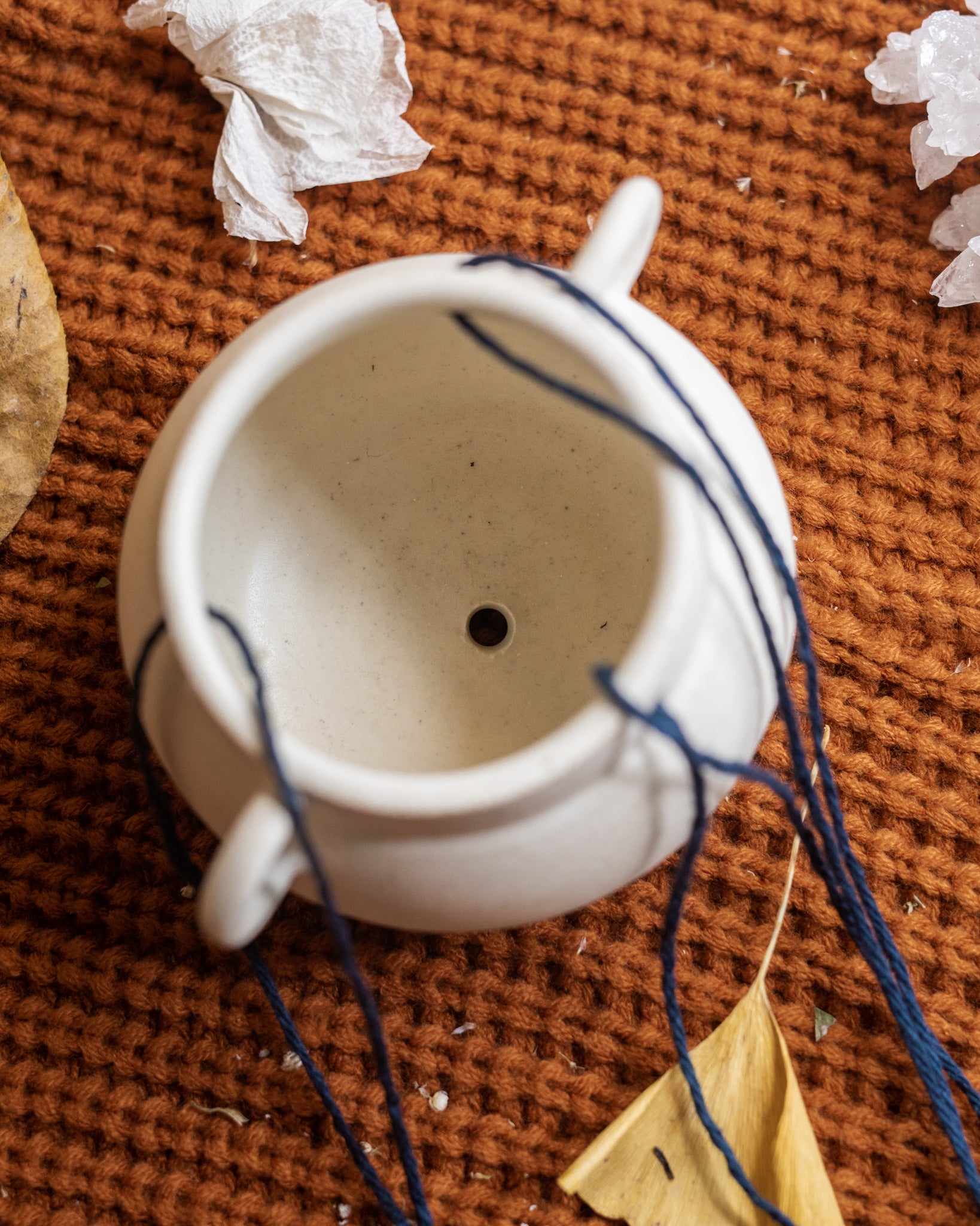 Has one drainage hole on the bottom. Strung with black, 100% cotton yarn.