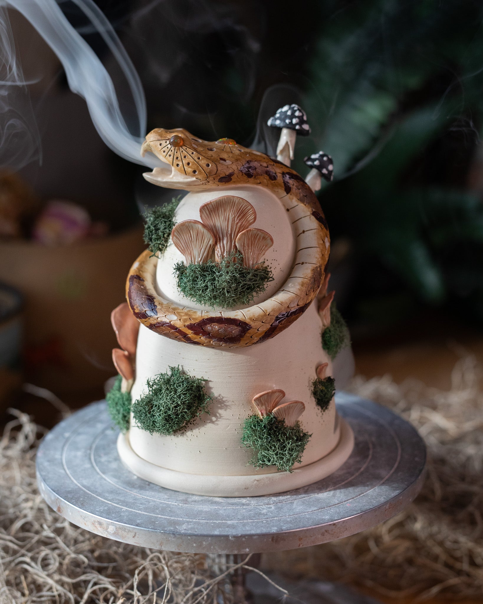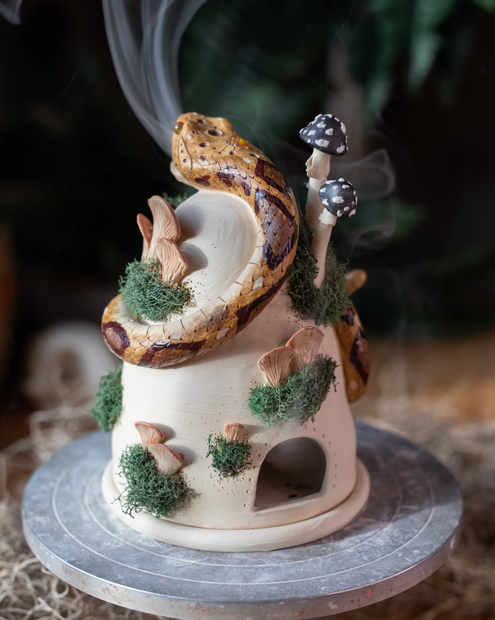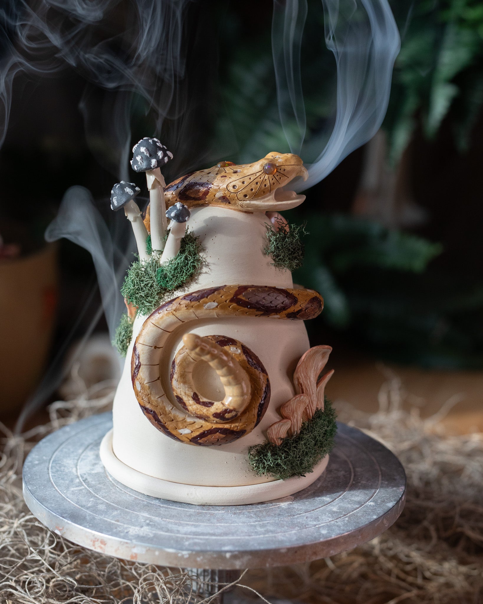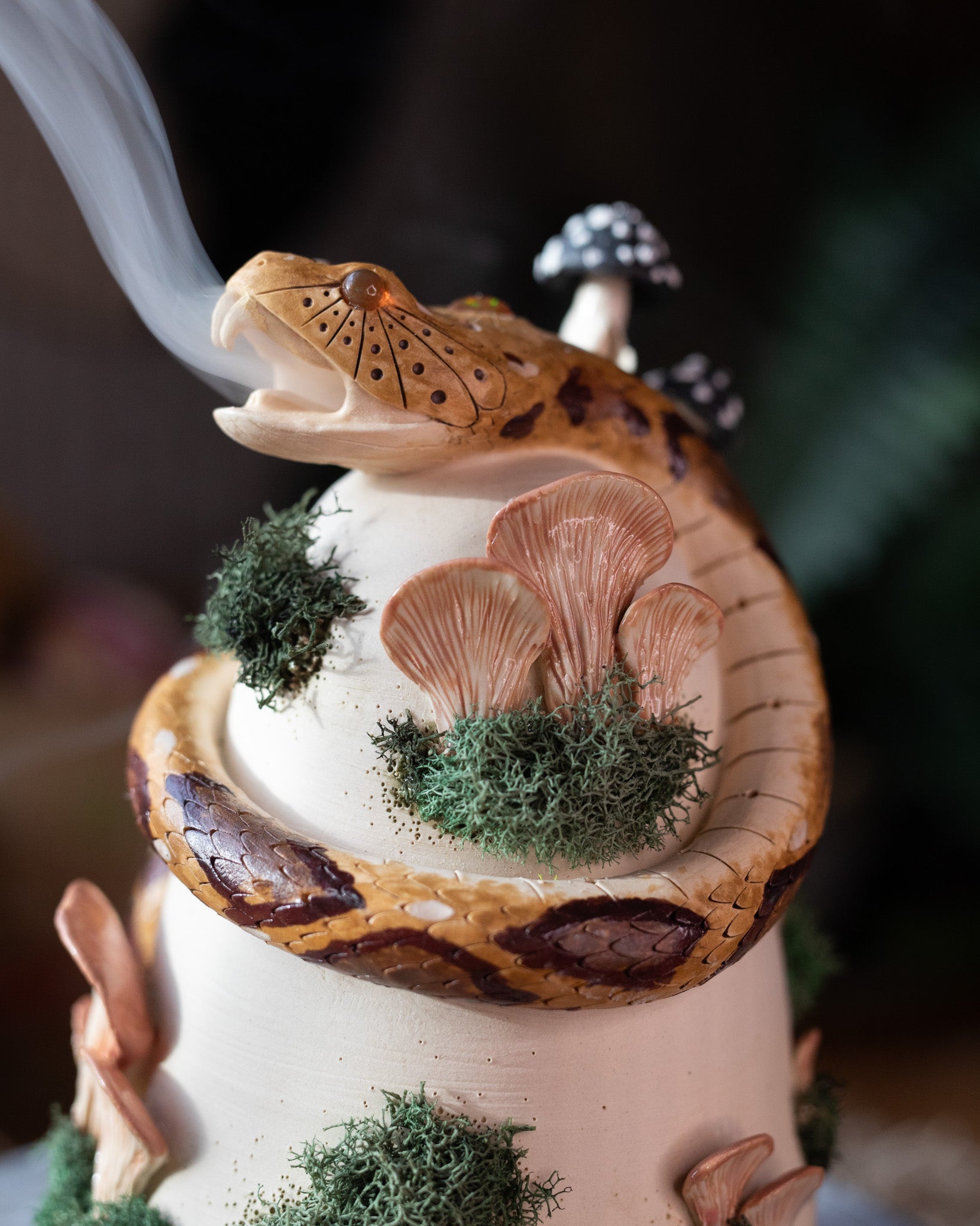 This piece started as two balls of white, stoneware clay that were thrown on the pottery wheel. Once firm enough to work it was trimmed then joined with a hand-sculpted rattlesnake and fungi. After slow drying, this piece was fired in the kiln then hand-painted and fired again.