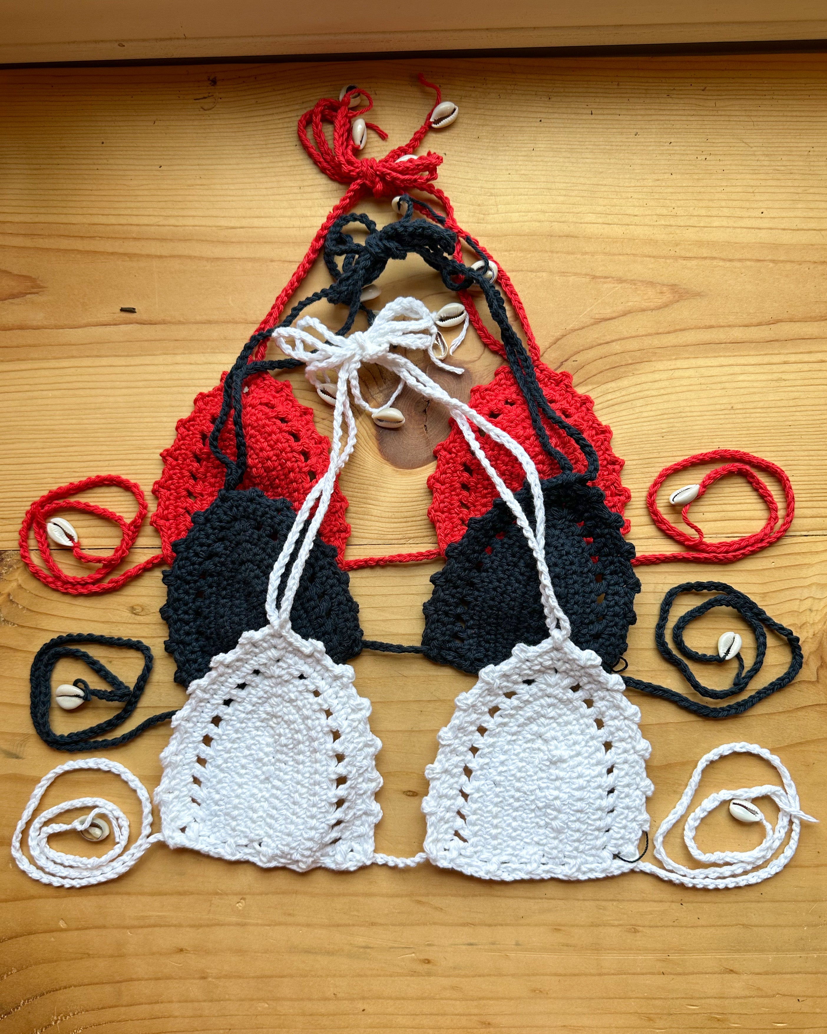 Featuring a cut out pattern around the cups and real cowrie shells at the end of the ties. Hand-crocheted with 100% cotton yarn in Melbourne, Florida.