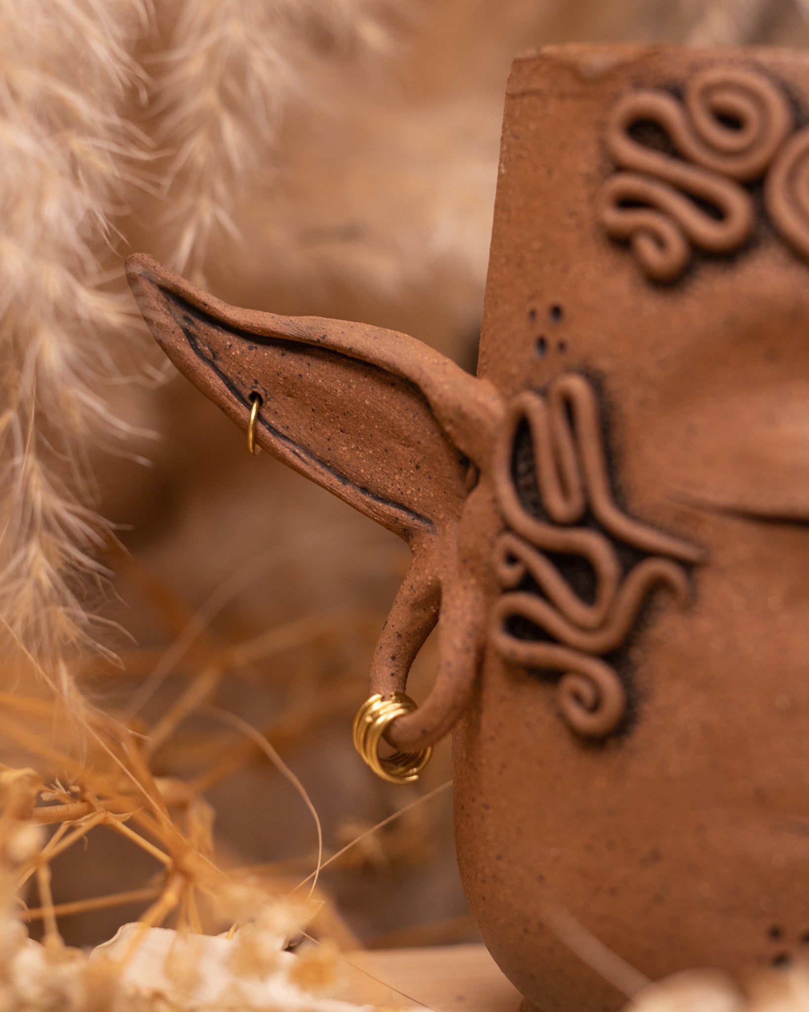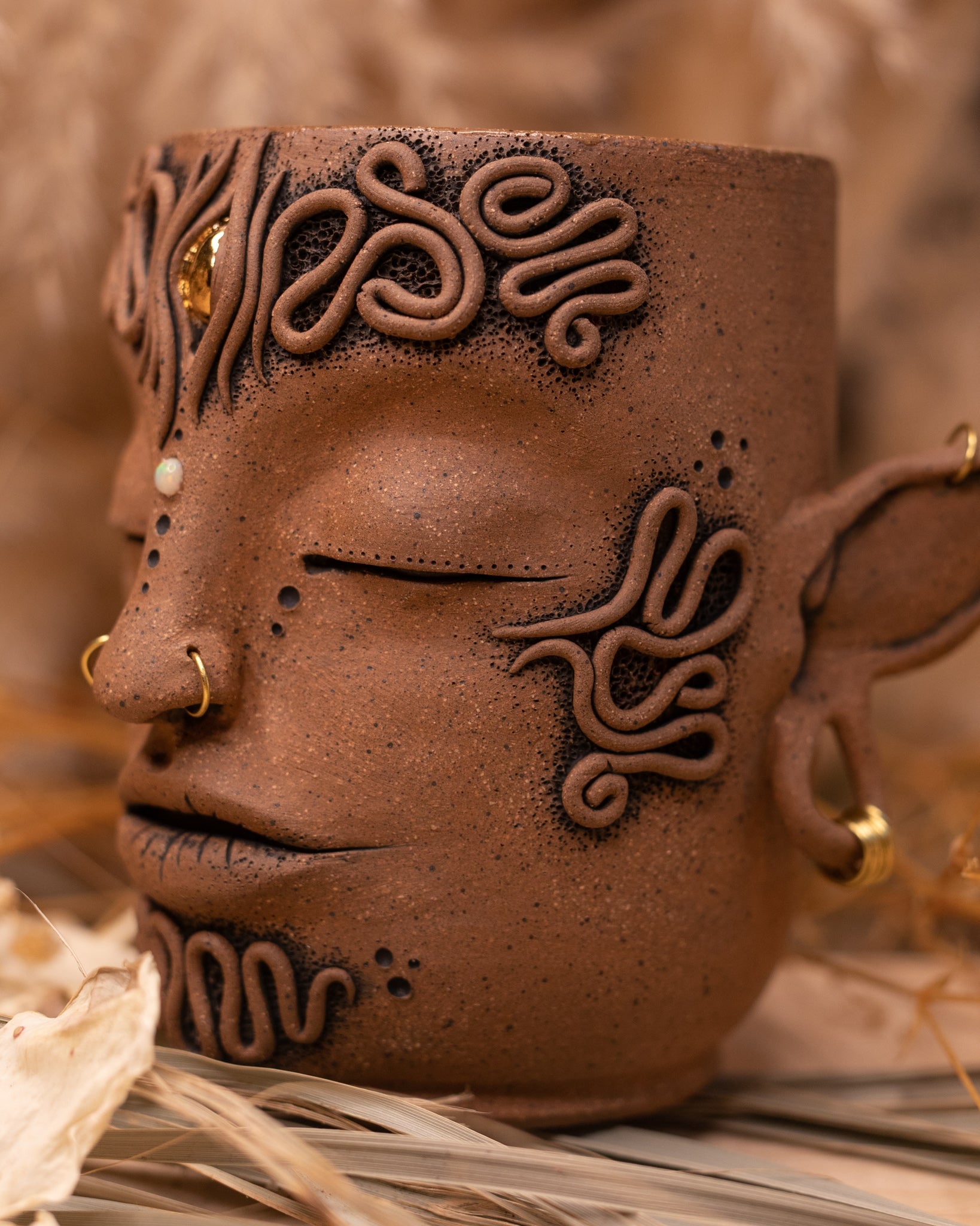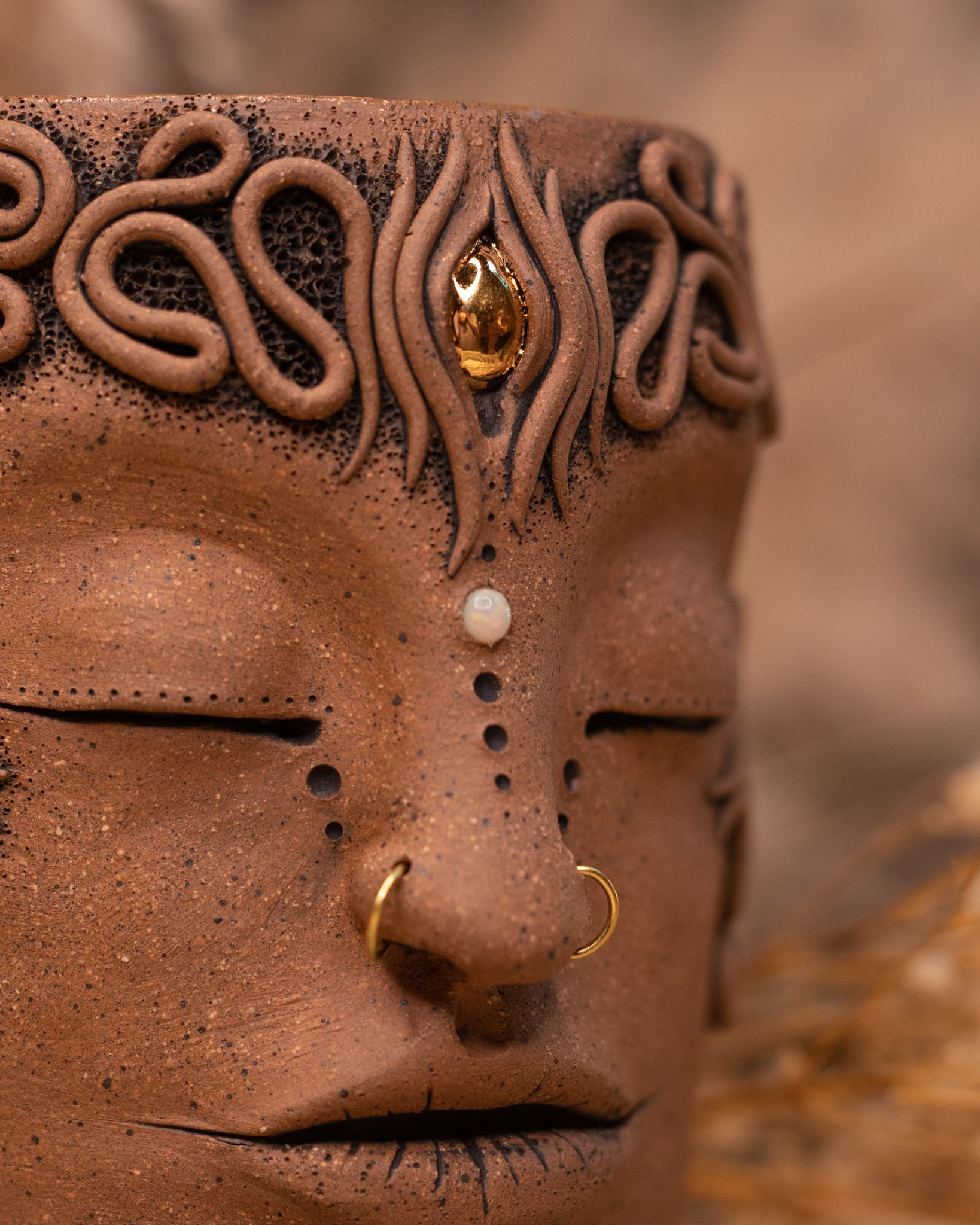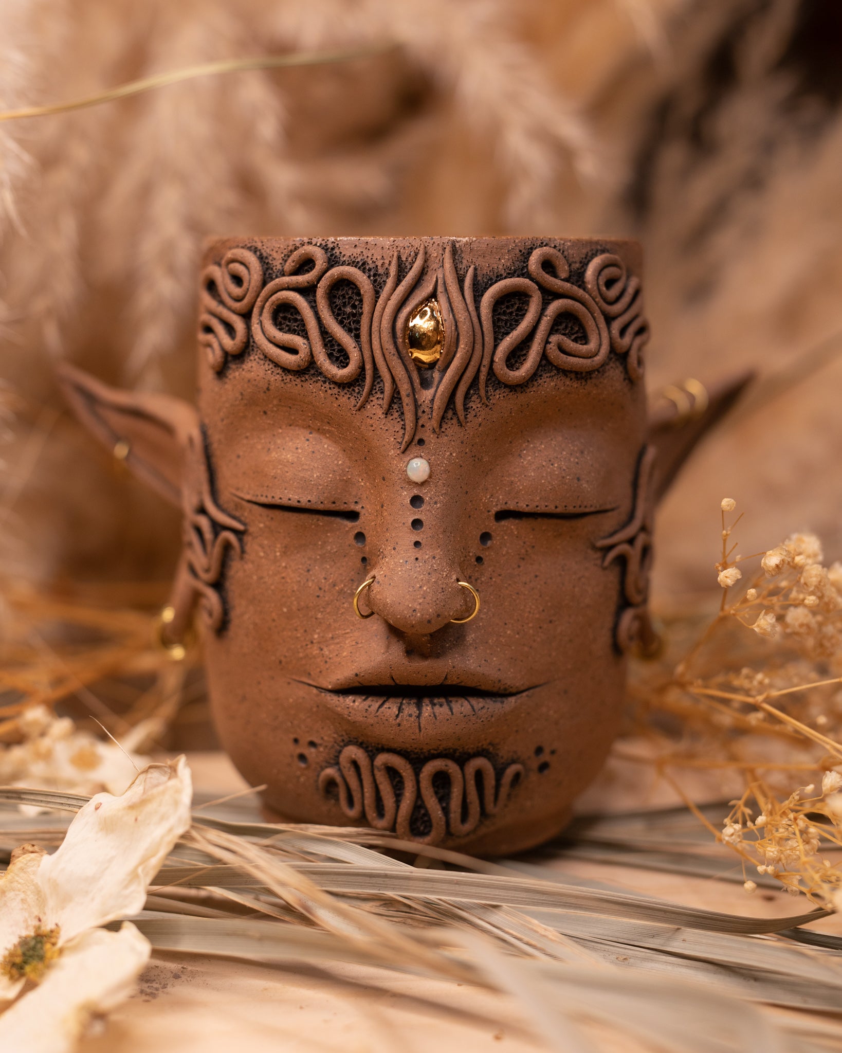 After slowly drying, it was fired, glazed and fired twice more. The faes forehead features a third eye wrapped in swirly adornments and the third eye is coated in precious 22 karat gold. The inside is coated in a glossy clear glaze.
